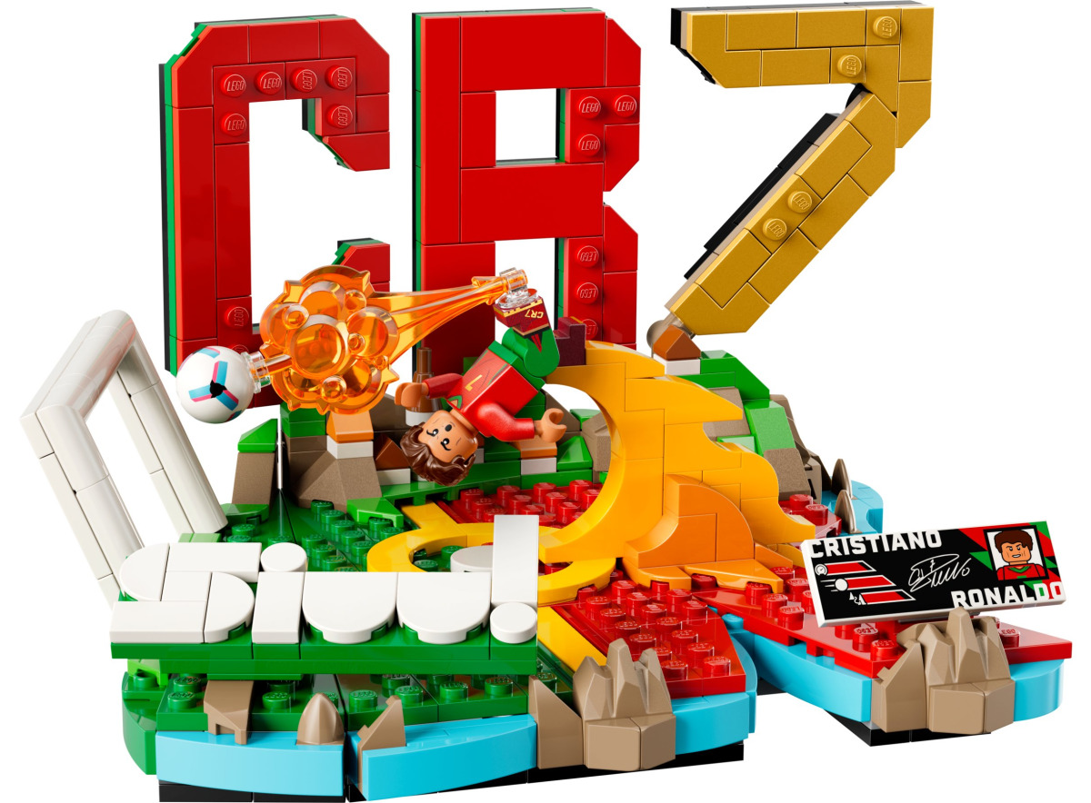 Le set comprend une minifigurine exclusive de Cristiano Ronaldo et une base affichant les couleurs de l'équipe nationale du Portugal, avec le sigle CR7 en grand. Une plaque collector porte sa signature et ses statistiques de carrière. L'ensemble mesure 11 cm de haut pour 21 cm de large — soit à peu près la taille d'une feuille A5 posée à plat.