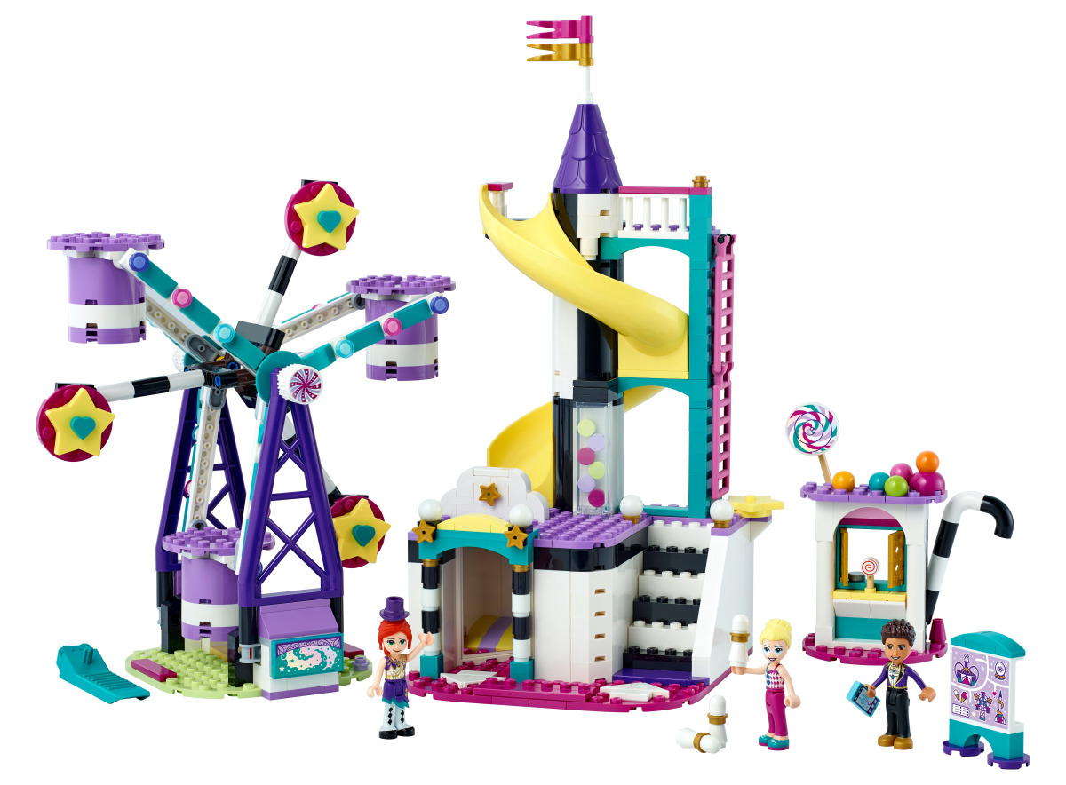 Le Lego® 41689 se distingue par sa mécanique de toboggan à miroirs, absente des autres sets de la gamme. Avec 545 pièces, deux structures de taille généreuse et 3 mini-poupées en costume, il offre un contenu solide pour les enfants de 7 ans et plus passionnés par l'univers de la fête foraine.