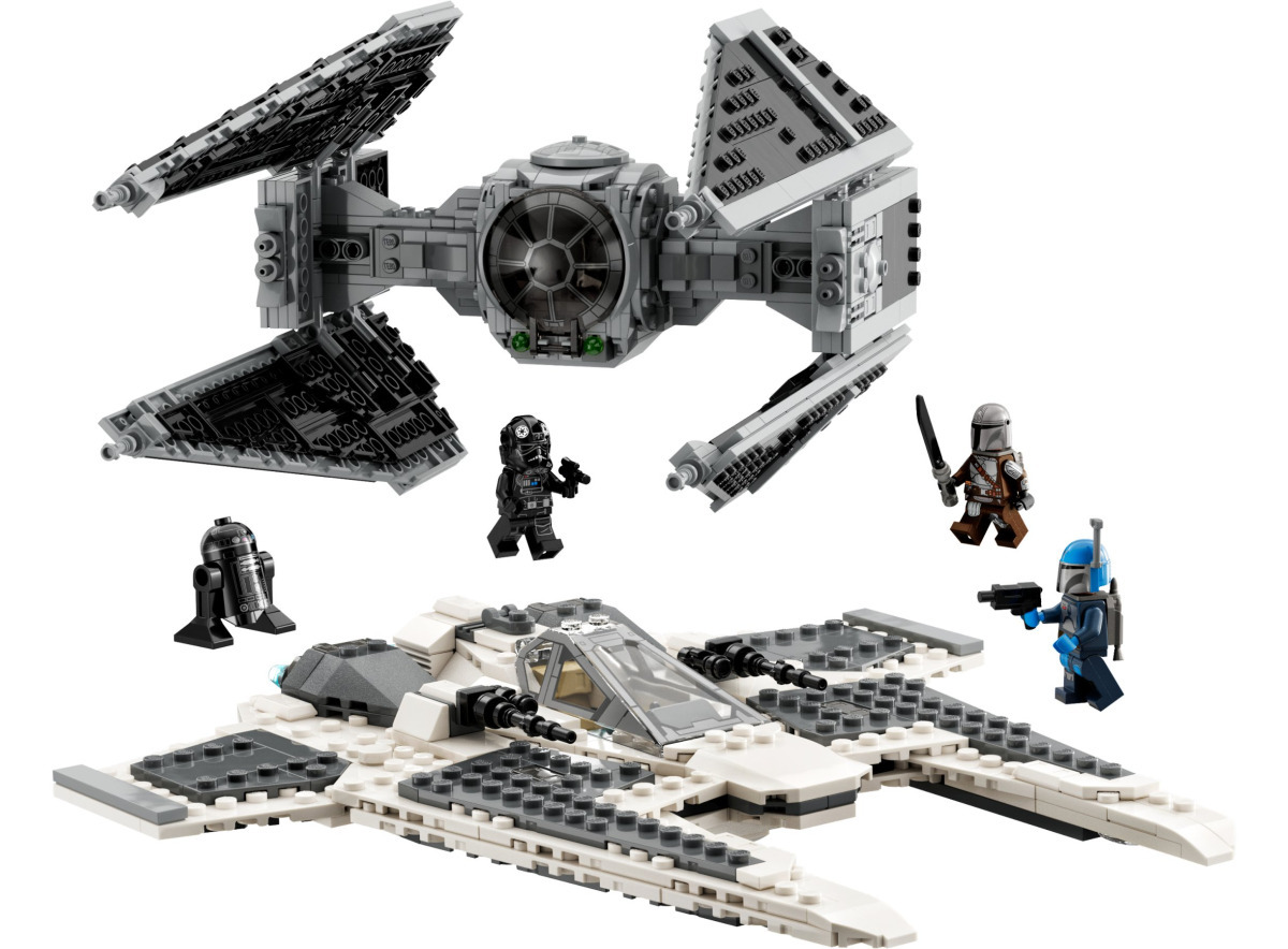 Le set comprend 3 minifigurines et un droïde : le Mandalorien avec un sabre noir, un commandant de la flotte mandalorienne avec pistolet blaster et jetpack, un pilote de TIE avec pistolet blaster, et le droïde R2-E6. Ces personnages sont des nouveautés introduites en mai 2023 dans la gamme Star Wars.